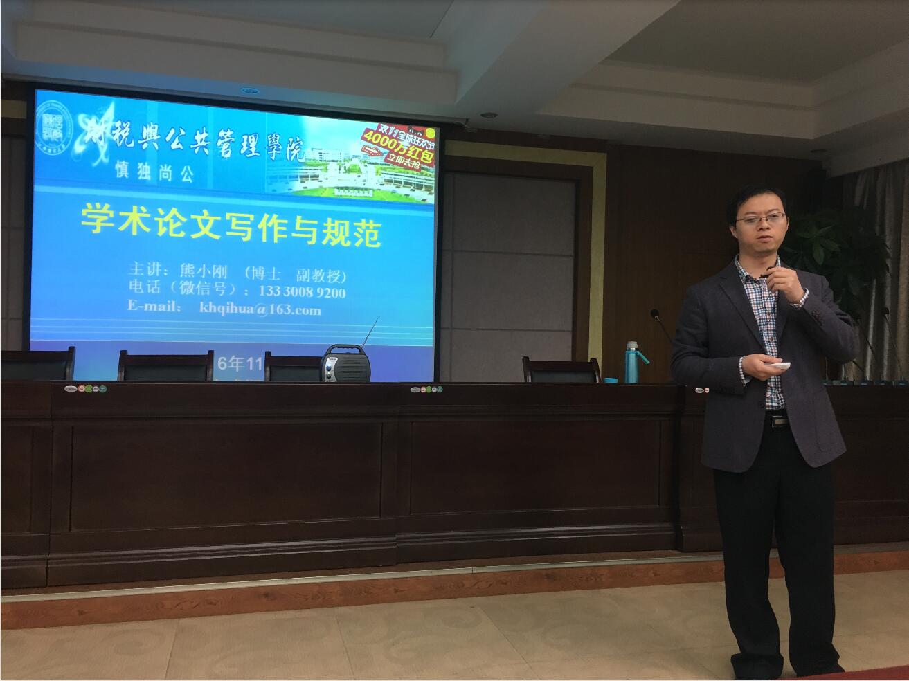 2016年11月6日晚,为帮助一年级研究生迅速掌握学术论文的写作方法和相关规范,尽快适应科学研究的角色,财税与公共管理学院研究生会邀请熊小刚副教授在财税大楼二楼会议室作题为“学术论文写作与规范”讲座。此次讲座旨在指导同学们如何做学术研究、如何进行学术论文写作,帮助同学们树立学术规范意识。学院所有16级研究生都积极参与讲座。