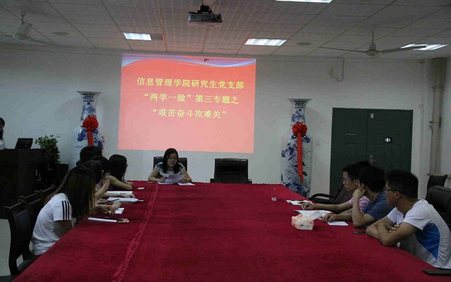 为进一步推进“两学一做”第三专题“艰苦奋斗攻难关”的学习,9月8日上午,信息管理学院全体研究生党员在H302开展学习研讨,研究生党支部书记邹俊主持会议。