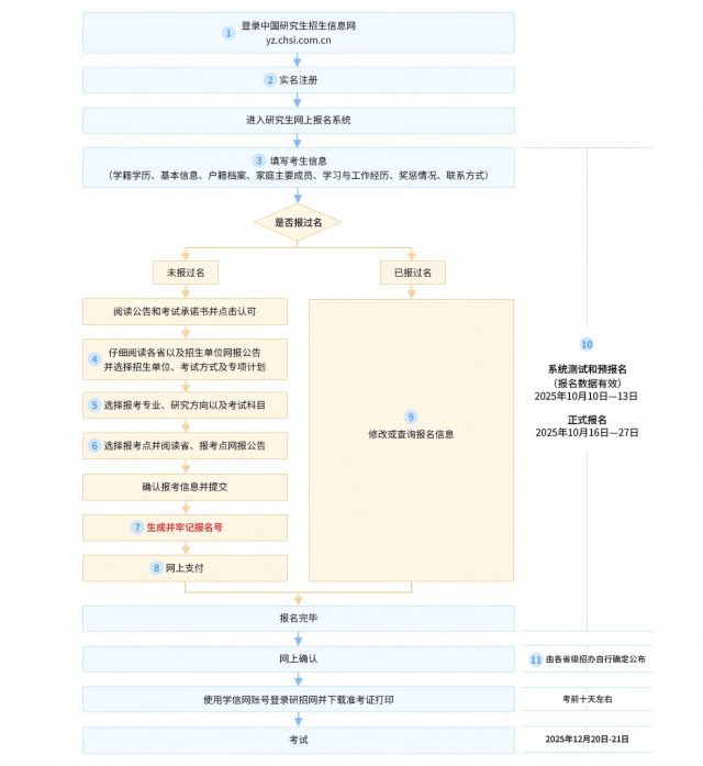 一、全国硕士研究生招生考试报名包括网上报名和网上确认两个阶段。其中,网上预报名时间:10月10—13日(每天9:00-22:00),预报名信息有效;正式报名时间:2025年10月16—27日(每天9:00-22:00),逾期不接受补报,也不得再修改报名信息。网上确认时间由各省级教育招生考试机构确定并公布。
